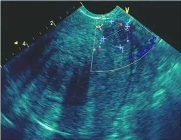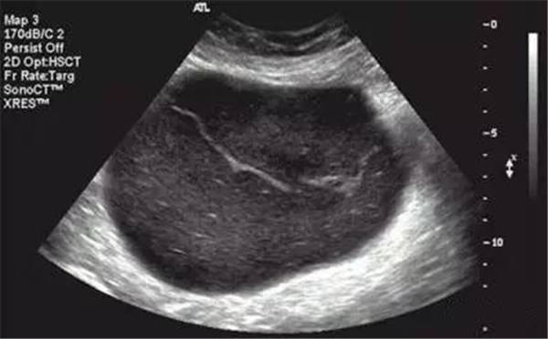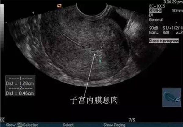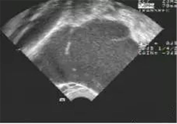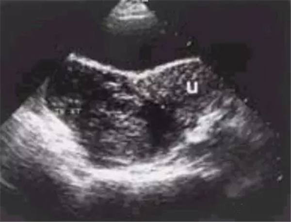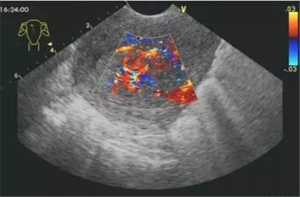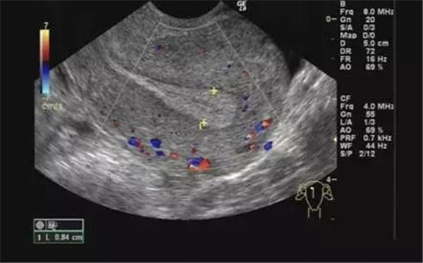 聲像圖特征:1、子宮均勻性增大,邊界規則。2、子宮內膜線前移。3、子宮內回聲不均勻,低回聲、強回聲區,無包膜。4、子宮大小、內部回聲月經前后常有變化。5、腫塊周圍無環狀或半環狀血流,阻力指數約0.6。