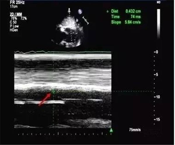 正常情況下,右室前壁運動幅度應>5 mm,右室游離壁運動幅度會>8 mm,但對肺栓塞(PTE)患者,右室壁基底部至游離部運動幅度減低,甚至消失。