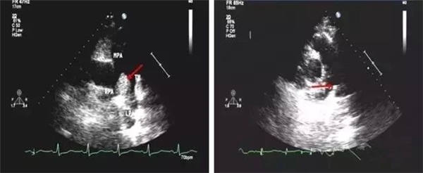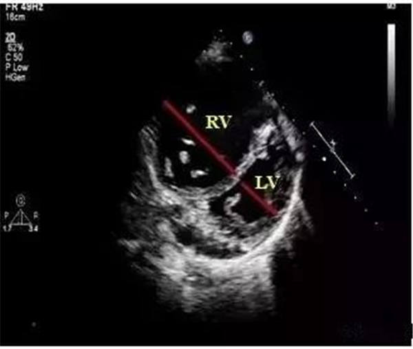 作為最特異的超聲心動圖特征,當右室/左室前后徑比值 > 0.5;右室/左室橫徑(右房/左房橫徑)比值 >1.1或者左心室收縮末期和舒張末期徑均減小,尤以舒張末期為著時,即可判定血栓性肺栓塞癥。